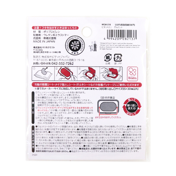 ウェットティッシュや除菌シートなどの各種パッケージに使えるワンプッシュで楽々オープンできるフタです。 抗菌加工を施しているので、衛生面もばっちり◎ 貼って、はがして繰り返しご使用いただけます!