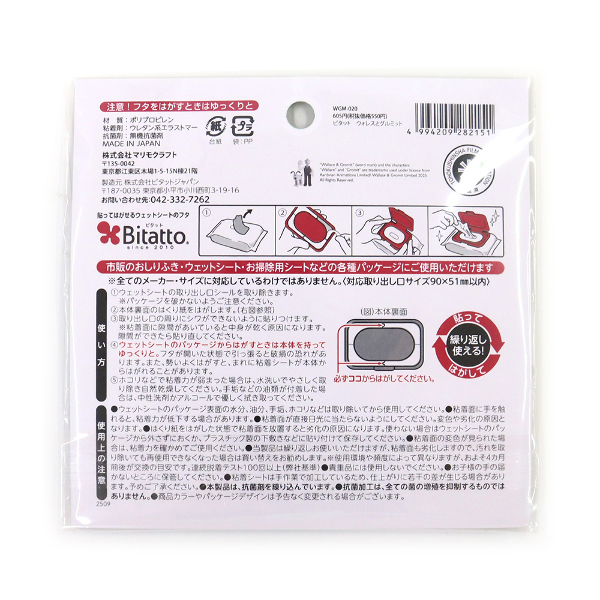 ウェットティッシュや除菌シートなどの各種パッケージに使えるワンプッシュで楽々オープンできるフタです。 抗菌加工を施しているので、衛生面もばっちり◎ 貼って、はがして繰り返しご使用いただけます!